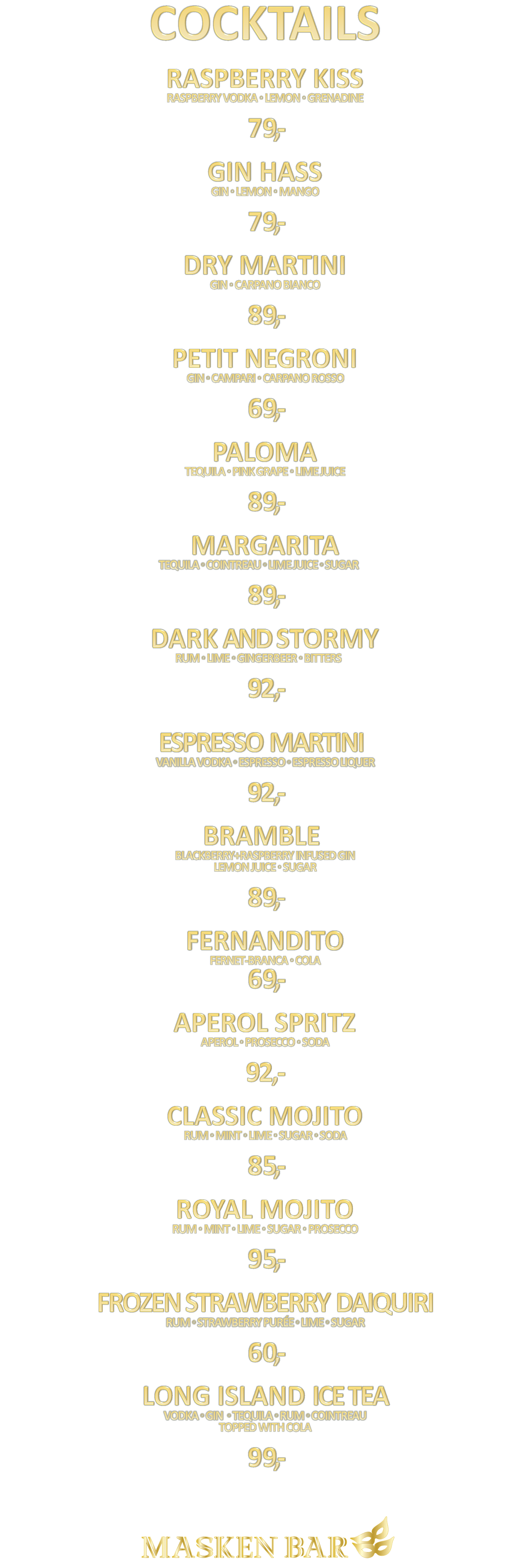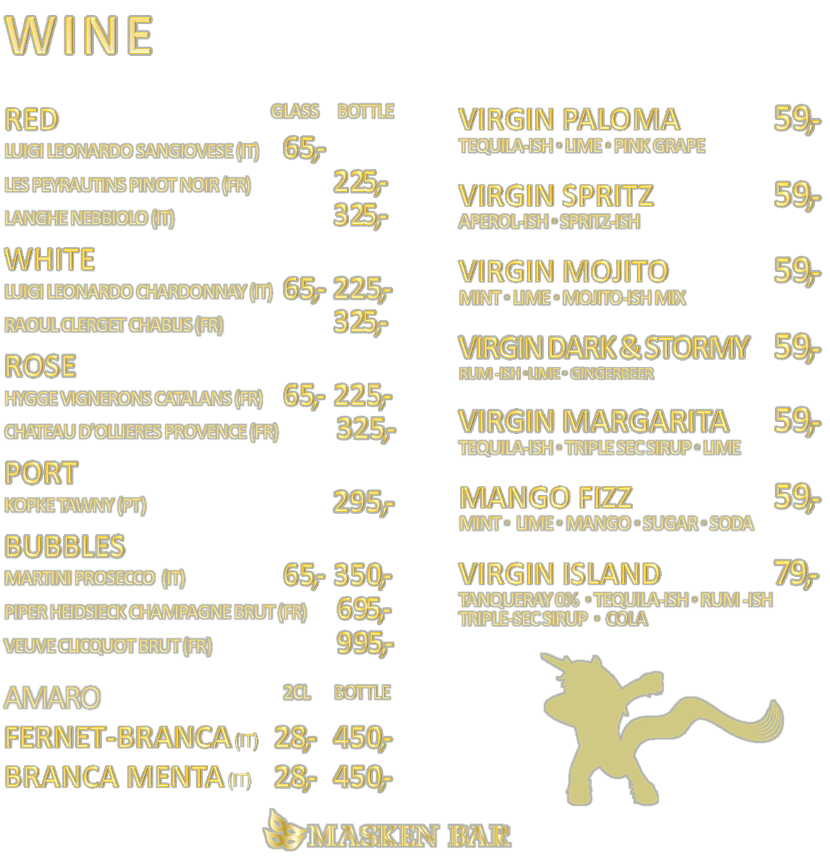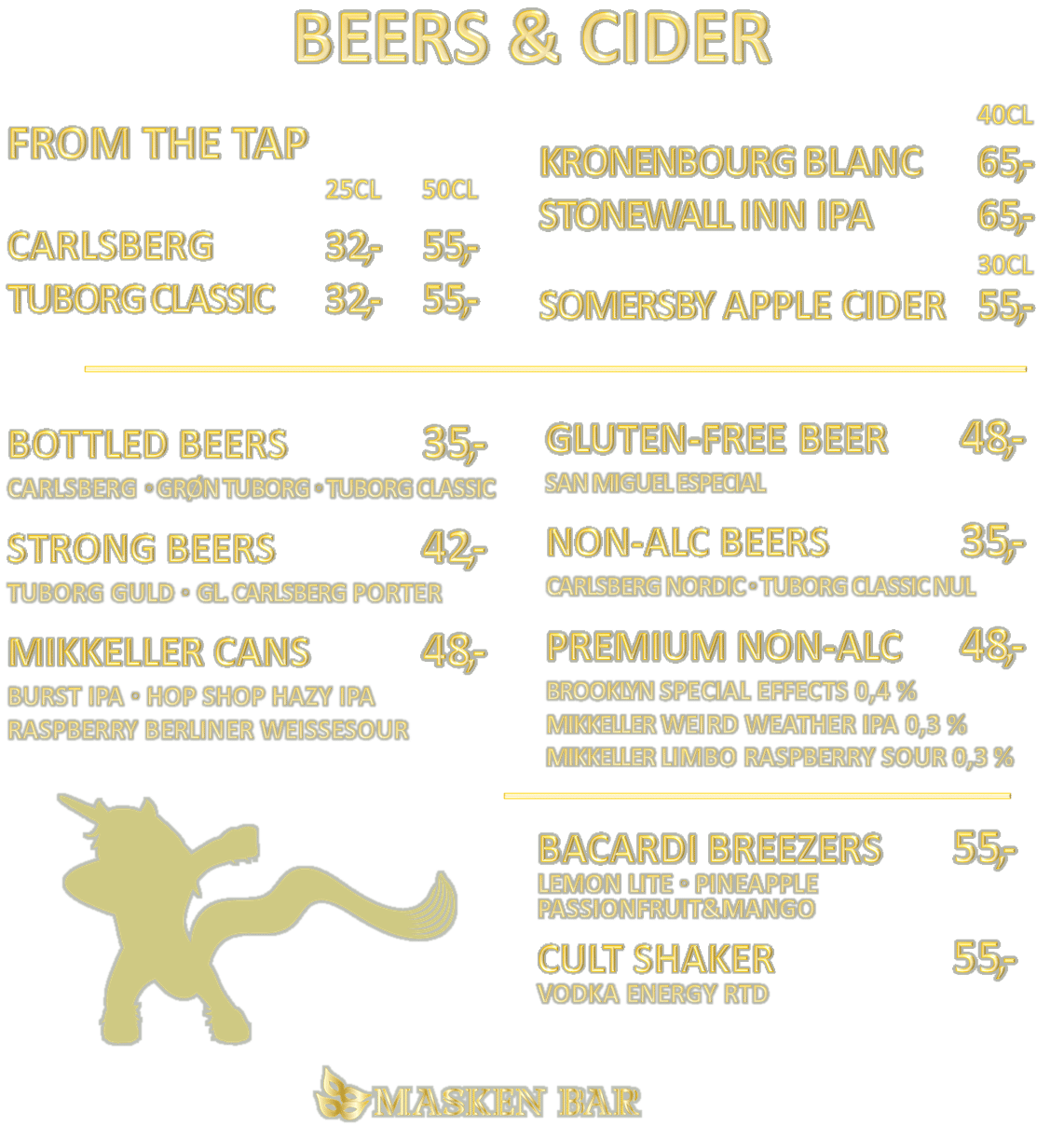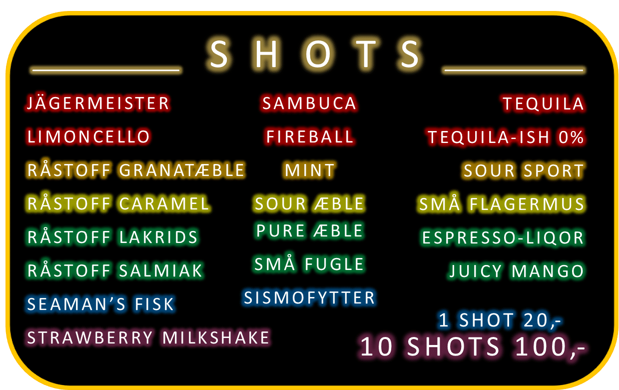 Vores udvalg af drinks Om man er til cocktails, sjusser, øl, shots eller vin har vi altid fornuftige priser, og musikken byder ofte op til dans på trods af vi ikke har et dansegulv.